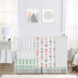 Mod Arrow Grey, Coral and Mint 4 Piece Bumperless Crib Bedding Collection