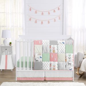 Woodsy Coral, Mint and Grey 4 Piece Bumperless Crib Bedding Collection
